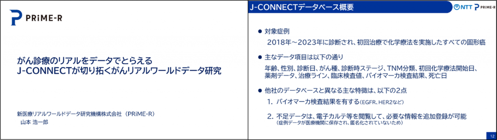 本大会の特別セッション「これから始めるリアルワールドデータ研究 ~代表ⅮB・事例を一挙に紹介~」で、「がん診療のリアルをデータでとらえる J-CONNECTが切り拓くがんリアルワールドデータ研究」の演題にて、産学連携による全国規模のリアルワールドデータ収集プロジェクトJ-CONNECT※2の概要・特長と収集したリアルワールドデータのユースケース等についてご紹介いたしました。