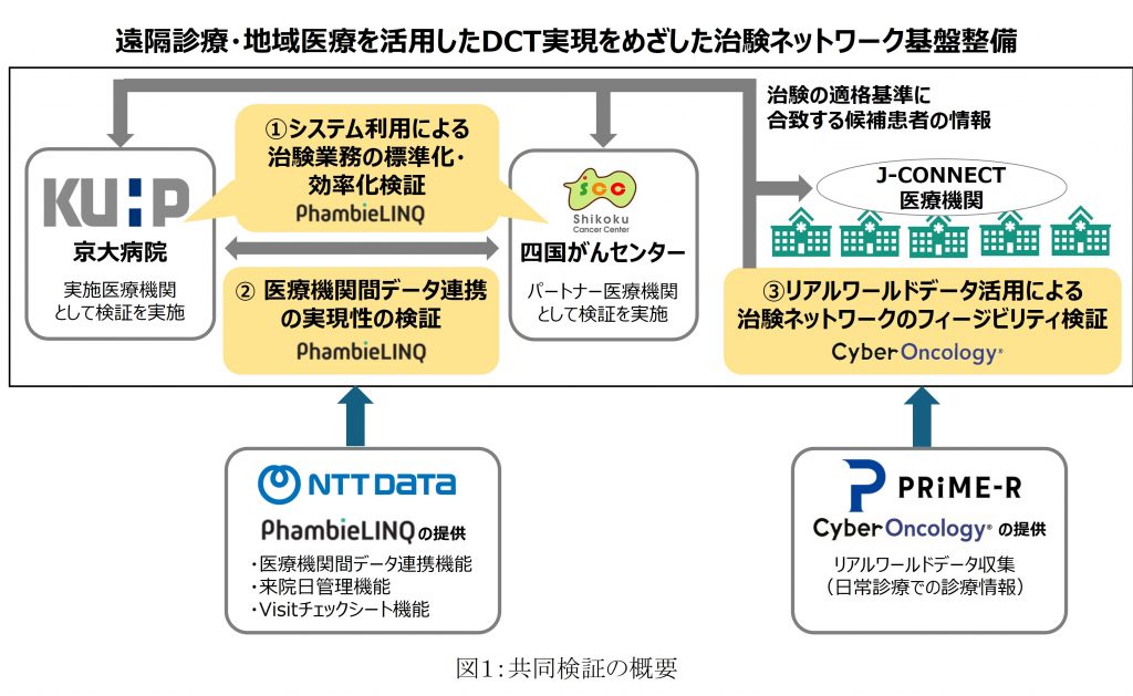 国立大学法人 京都大学医学部附属病院(所在地:京都府京都市、病院長:髙折 晃史、以下:「京大病院」 )、独立行政法人 国立病院機構 四国がんセンター(所在地:愛媛県松山市、病院長:山下 素弘、以下:「四国がんセンター」 )、新医療リアルワールドデータ研究機構株式会社(本社:京都府京都市、代表取締役社長:是川 幸士、以下:「PRiME-R」 )と、株式会社NTTデータ(本社:東京都江東区、代表取締役社長:鈴木 正範、以下:「NTTデータ」 )は、治験実施医療機関とは別のパートナー医療機関にて臨床試験を行える「分散型臨床試験(DCT) 」の実現を見据えた治験業務の効率化に関する共同検証(以下:「本検証」 )を2025年10月22日より開始しました。